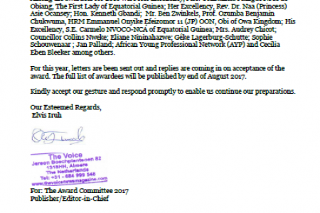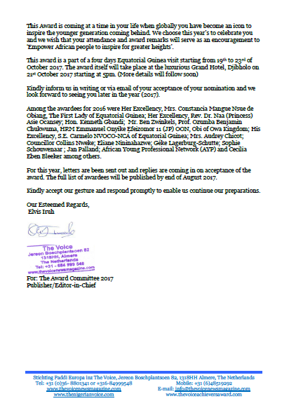 لقد جاءت هذه الجائزة في تلك الفترة من حياتكم التي اصبحت فيها ايقونة لالهام جيل الشباب الاتي من بعدنا . لقد اخترنا هذا العام للاحتفال بكم ونامل حضوركم حيث ان الاعلان عن الجائزة سيكون بمثابة تشجيع لتمكين الافارقة من التطلع لافاق اعلى .