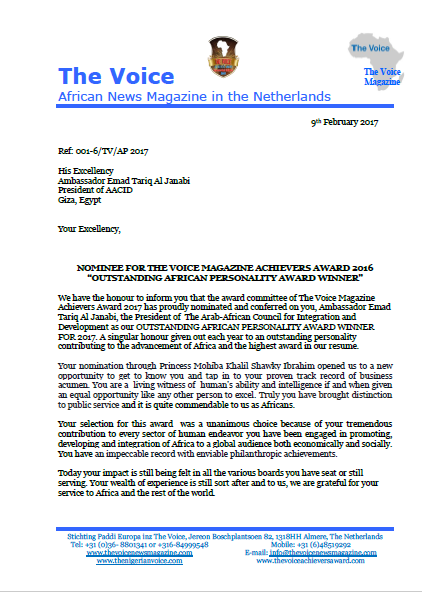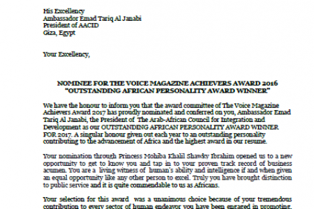 يشرفنا اخطار سيادتكم بان لجنة الترشيح لرجل انجازات 2017 بمجلة the voice Magazinee قد رشحت بالاجماع وبكل فخر شخصكم السفير عماد طارق الجنابي رئيس المجلس العربي الافريقي للتكامل والتنمية لنيل جائزة التميز بالتنمية الافريقية للعام 2017 .