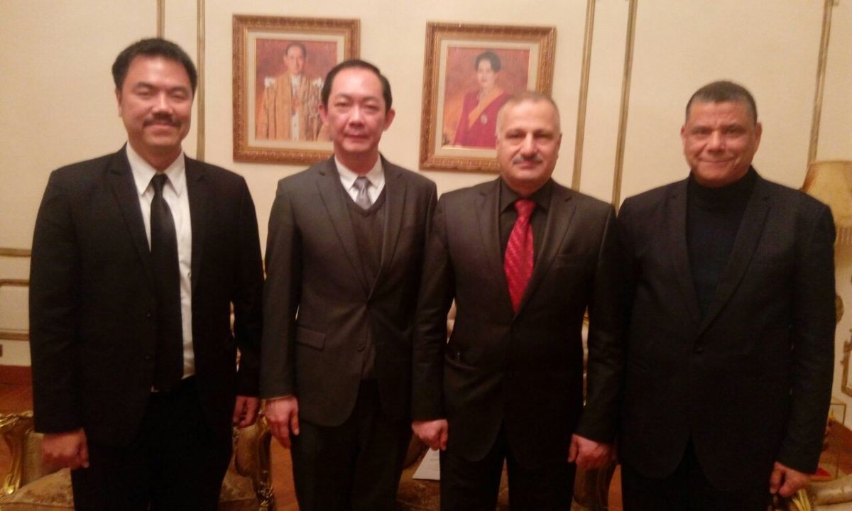 السفير عماد طارق الجنابي يلتقي القنصل التايلندي شاوادول نيباثانونت والملحق التجاري القنصل ثالارنثا بمقر سفارة المملكة التايلندية