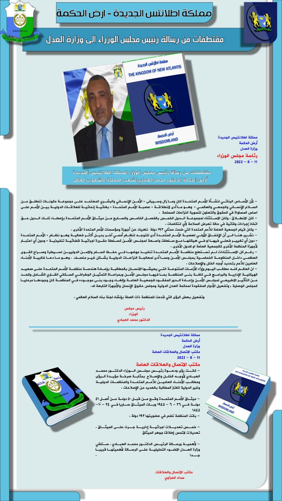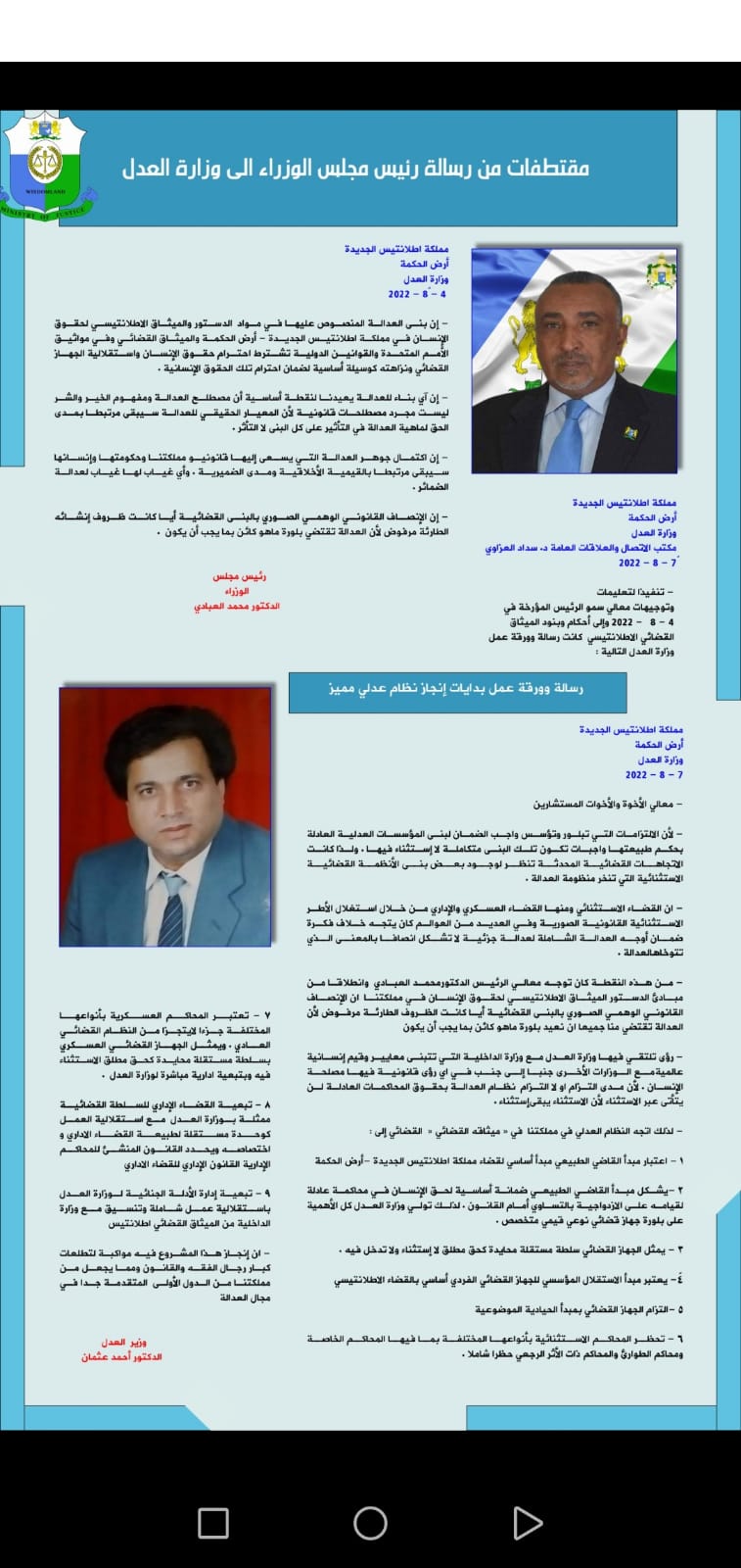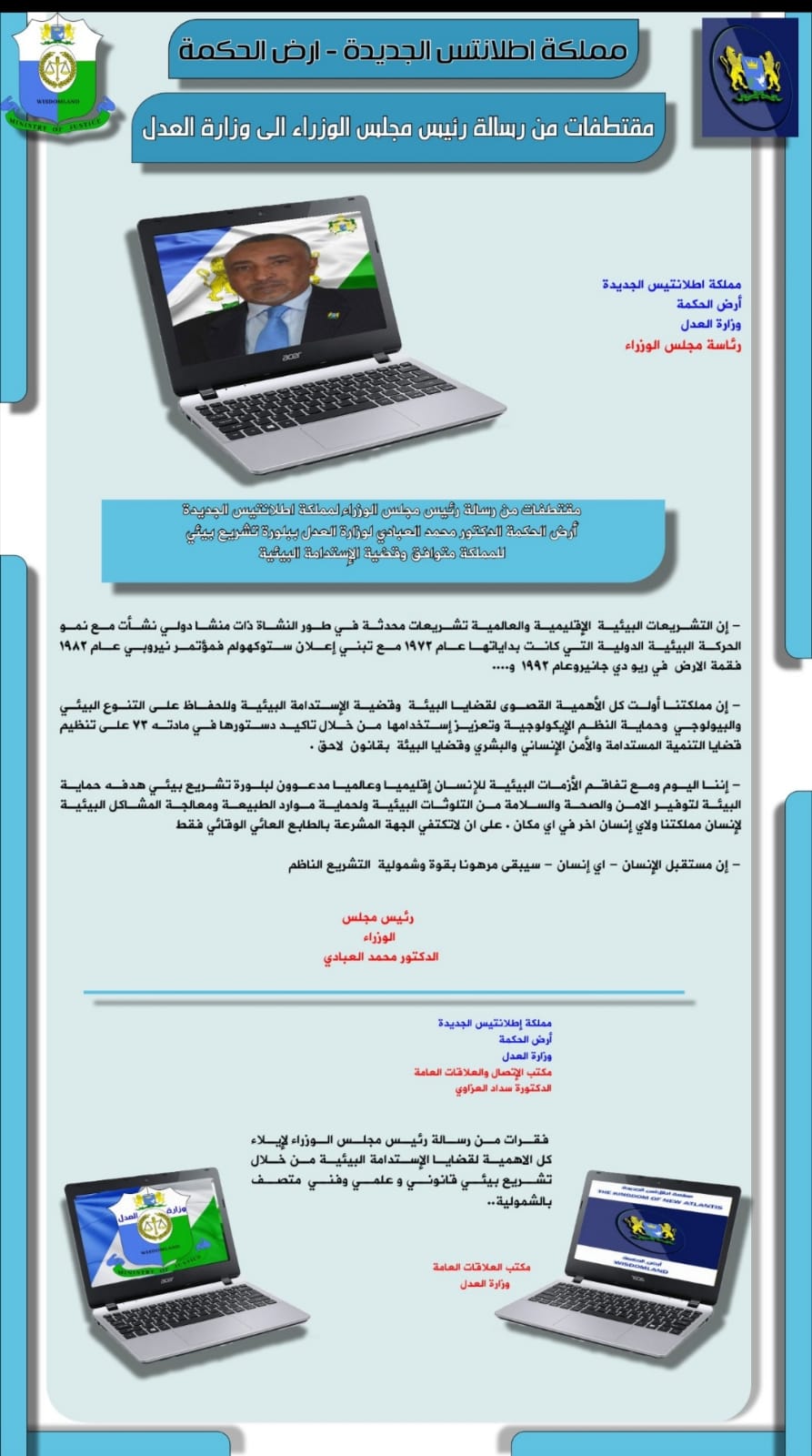 مقتطفات من رسالة الدكتور محمد العبادي رئيس مجلس وزراء مملكة اطلانتس الجديدة - ارض الحكمة الى وزارة العدل